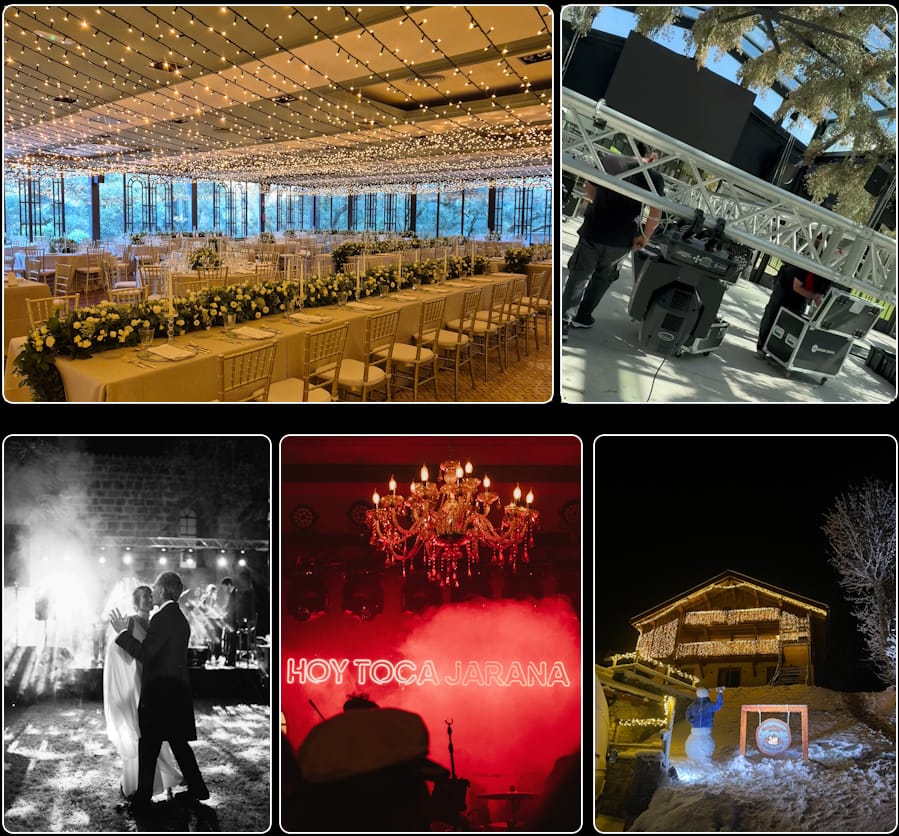 Siempre necesaria en cualquier montaje, pista de baile espectacular, potencia los espacios con luz indirecta, resalta la arquitectura, decora con cortinas o da protagonismo de un momento con un cañón de luz.